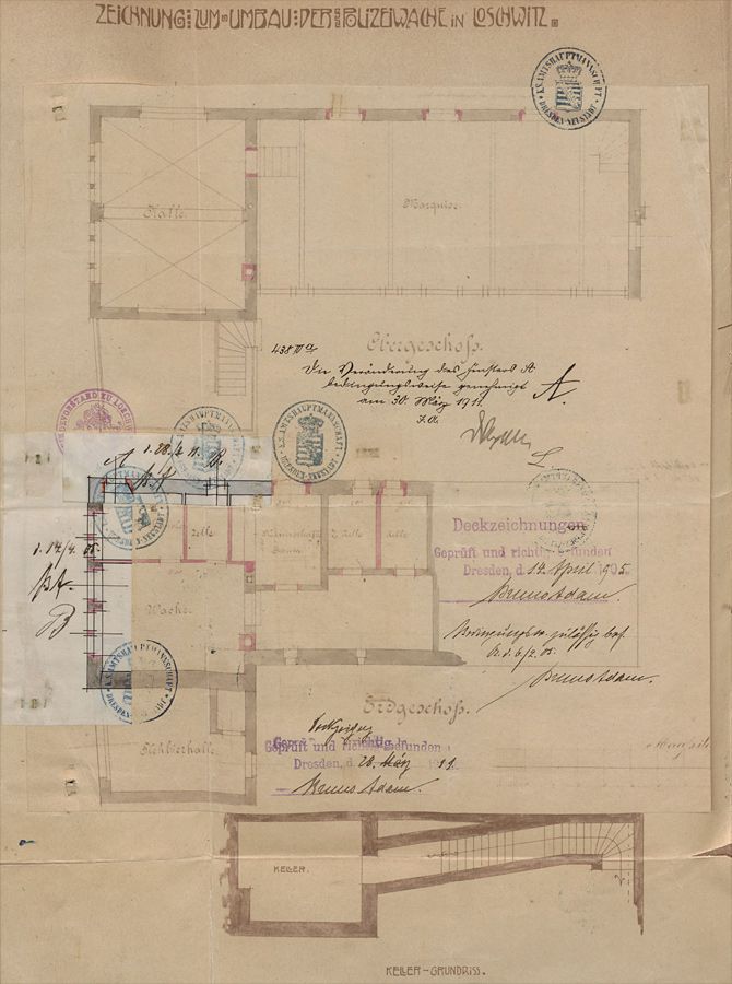 - 1905 erfuhr das Vordergebäude mit der Polizeiwache eine Veränderung der unteren, zum Körnerplatz gelegenen Fassade. Durch Wegfall eines bis dahin vorhandenen kleinen Produktladens erhielt sie eine Mitteltür mit jeweils zwei Fenstern zu beiden Seiten. Am Ostgiebel wurde eine Stehbierhalle angebaut und das heute wieder vorhandene Giebelfenster zugesetzt.