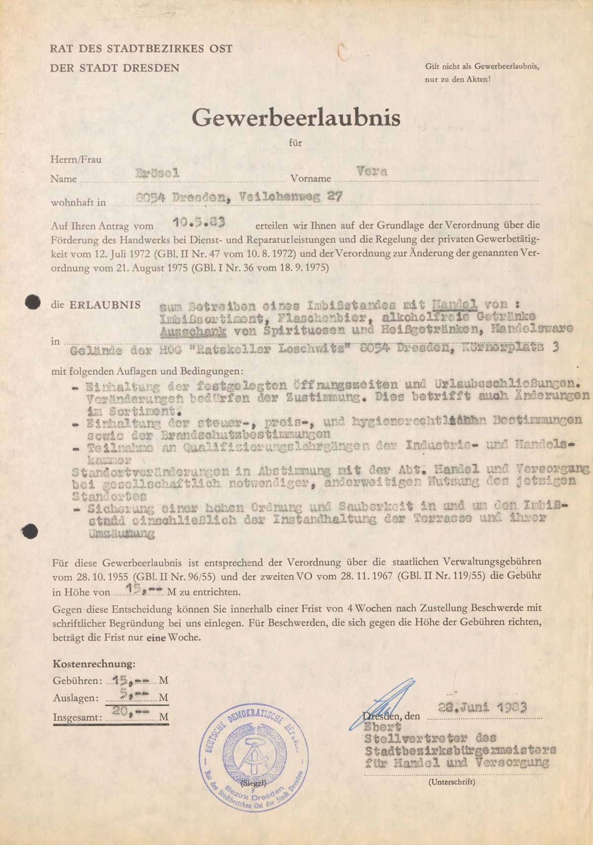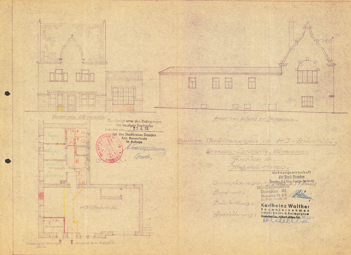 - 1945 im August erfolgte die Erneuerung der Erlaubnis zum Schankbetrieb durch den Rat der Stadt Dresden und 1947 auch für die Terrasse und Veranda.